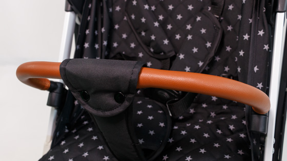 Бампер и ручка коляски выполнены из качественной эко-кожи, которую можно протирать антибактериальными средствами.